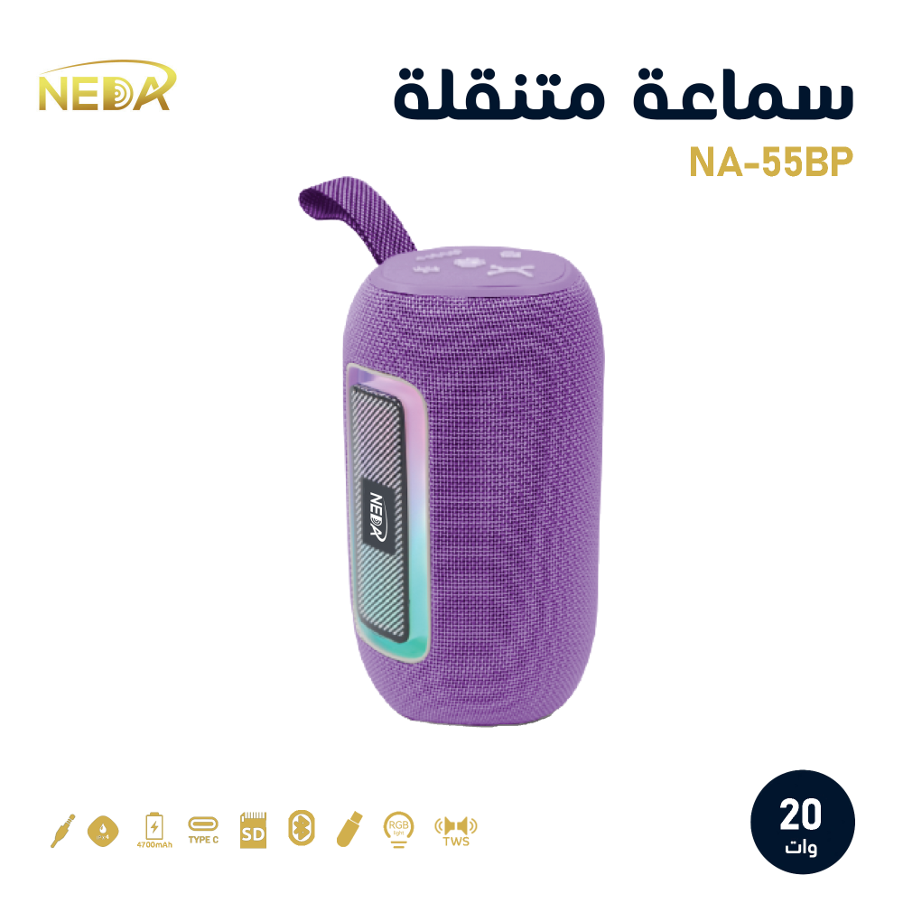 سماعات مكبر صوت بلوتوث NEDA NA-55BG بقوة 20 وات تجيب لك تجربة صوتية مميزة وين ما كنت. تصميمها باللون الرمادي أو الموف أنيق ومتين، ومع مقاومة الماء IPX5 تقدر تأخذها معك للشاطئ أو التخييم بدون ما تشيل هم. البلوتوث السريع والبطارية اللي تدوم لساعات يخلونها الخيار المناسب لكل طلعاتك ومناسباتك.